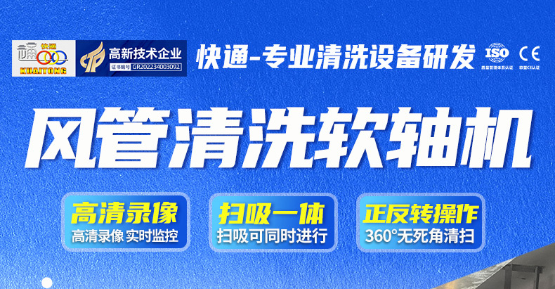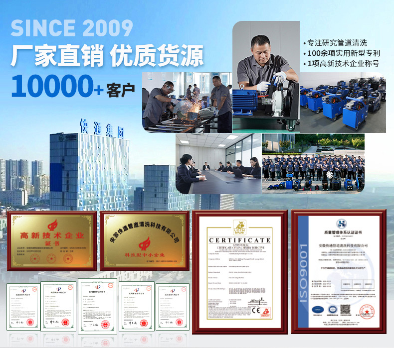 安徽快通是国家高新技术企业(GR202534002581),专注中央空调清洗设备,锅炉清洗机,管道检测机器人等